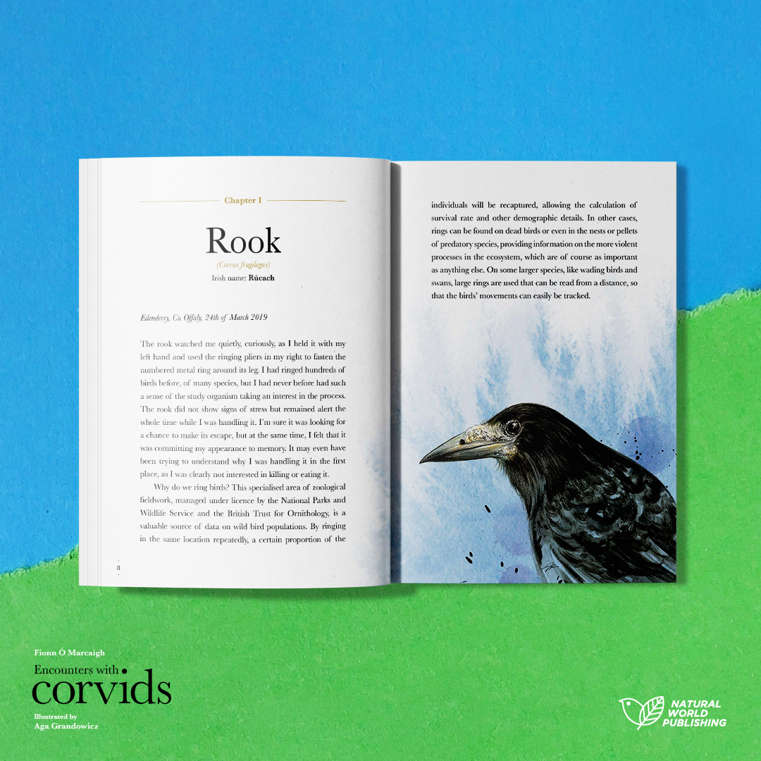 I’m thrilled to introduce you to a brand-new book I had the pleasure of working on with the wonderfully talented Dr Fionn Ó Marcaigh (TCD, Zoology). His insightful and beautifully written text for Encounters with corvids made illustrating and designing this book an absolute joy.