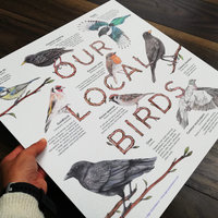 A mini information board/poster featuring a selection of European birds (magpie, robin, blue tit, crow, wood pigeon, goldfinch and blackbird) and their eating habits.