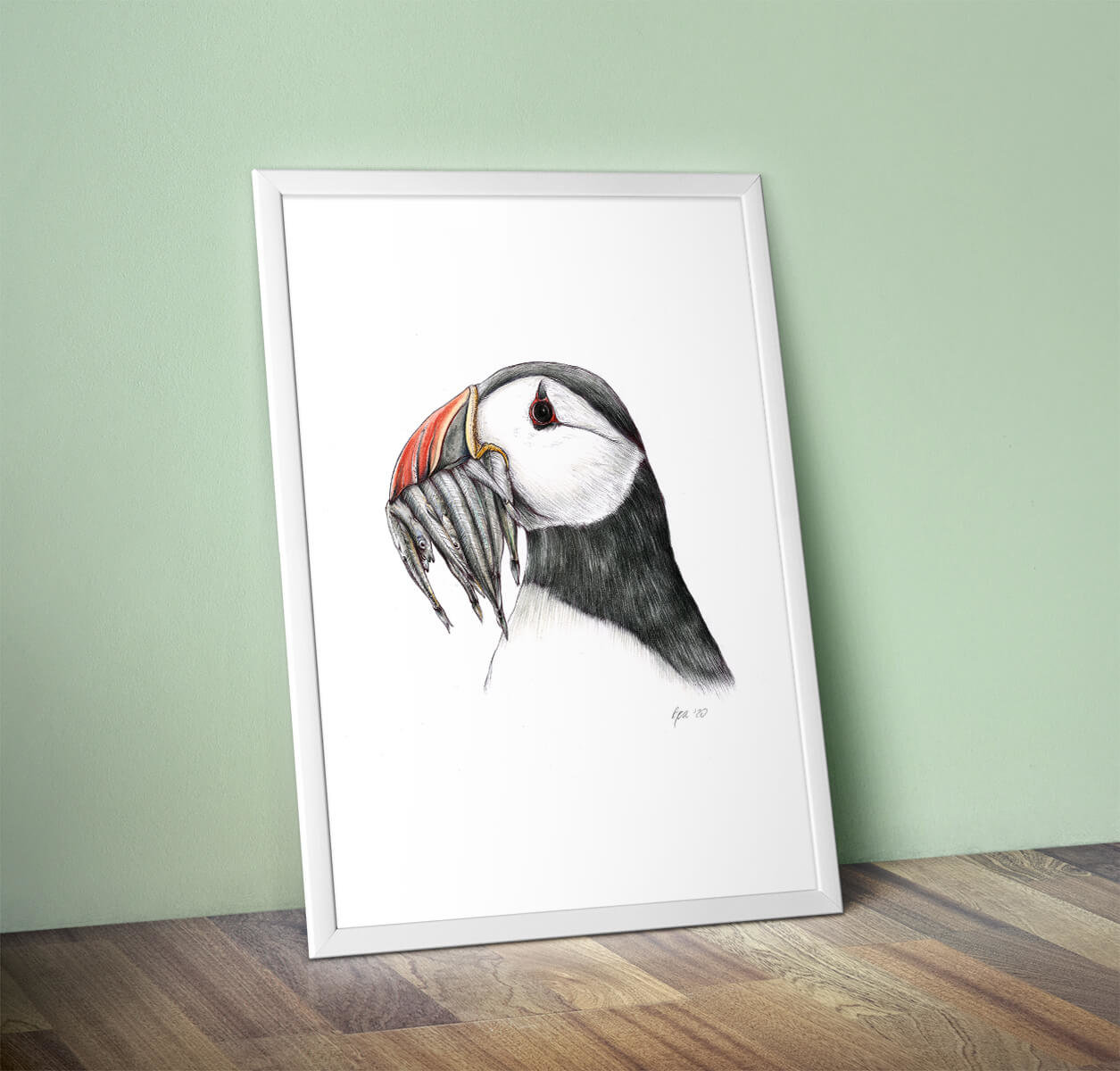 Wildlife illustration of an Atlantic puffin, original artwork.